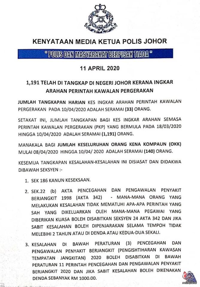 1,191 Telah Ditangkap Di Negeri Johor Kerana Ingkar Arahan Perintah Kawalan Pergerakan.