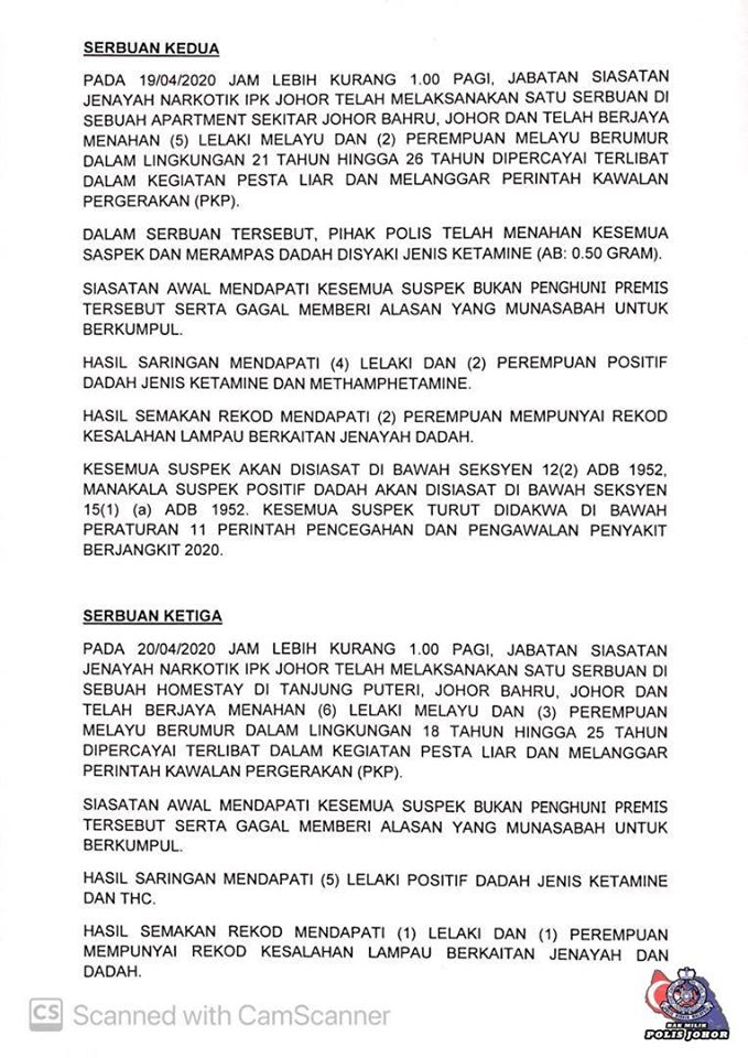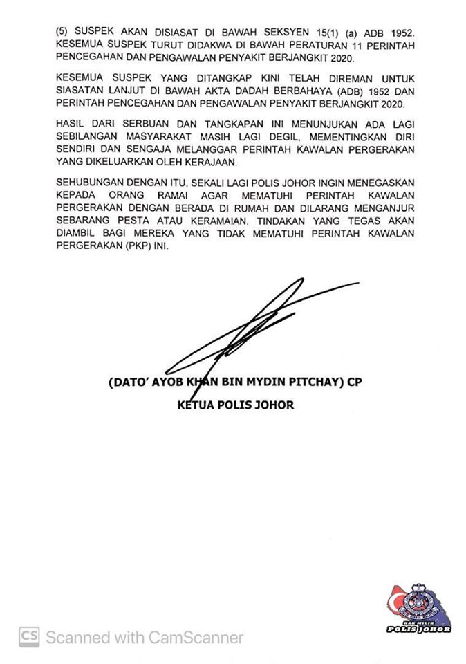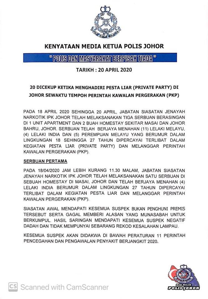 20 Dicekup Ketika Menghadiri Pesta Liar (Private Party) Di Johor Sewaktu Tempoh Perintah Kawalan Pergerakan (PKP).