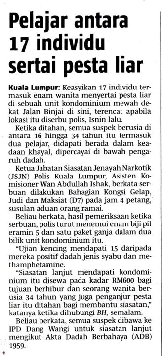 Keasyikan 17 individu termasuk enam wanita menyertai pesta liar di sebuah unit kondominium mewah dekat Jalan Binjai di sini, terencat apabila lokasi itu diserbu polis, Isnin lalu.