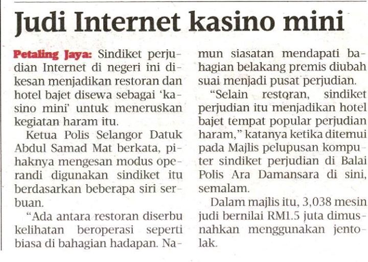 Sindiket perjudian Internet di negeri ini dikesan menjadikan restoran dan hotel bajet disewa sebagai ‘kasino mini' untuk meneruskan kegiatan haram itu.