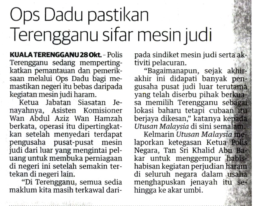 Kuala Terengganu, 29 Oktober - Polis Terengganu sedang mempertingkatkan pemantauan dan pemeriksaan melalui Ops Dadu bagi memastikan negeri itu bebas daripada kegiatan mesin judi haram.