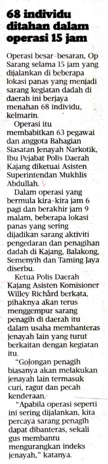 Operasi besar-besaran, Op Sarang selama 15 jam yang dijalankan di beberapa lokasi panas yang menjadi sarang kegiatan dadah di daerah ini berjaya menahan 68 individu, kelmarin.