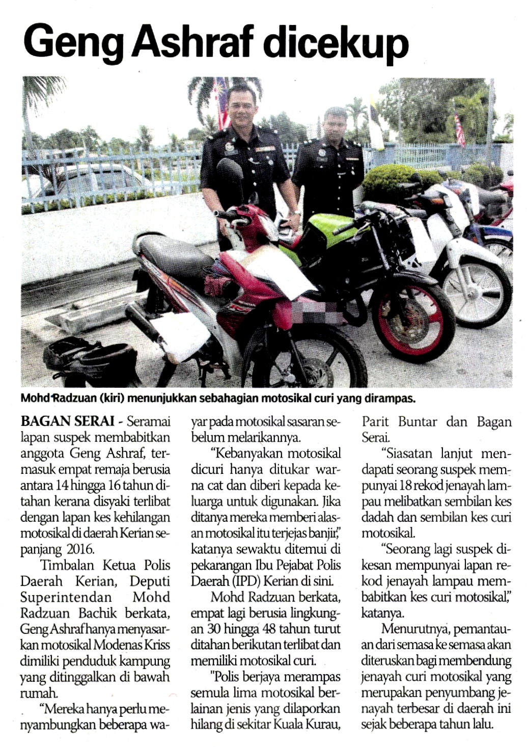 Seramai lapan suspek membabitkan anggota Geng Ashraf, termasuk empat remaja berusia antara 14 hingga 16 tahun ditahan kerana disyaki terlibat dengan lapan kes kehilangan motosikal di daerah Kerian sepanjang tahun 2016.