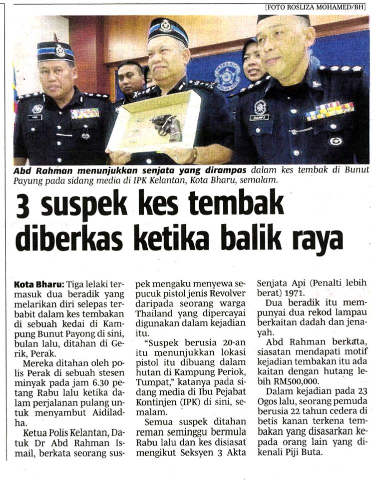 "Suspek berusia 20-an itu menunjukkan lokasi pistol itu dibuang dalam hutan di Kampung Periok, Tumpat," katanya pada sidang media di Ibu Pejabat Kontinjen (IPK) di sini, se-malam.