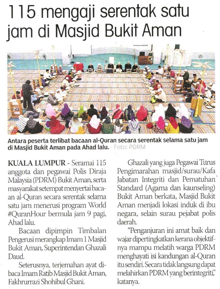 Kuala Lumpur - Seramai 115 anggota dan pegawai Polis Diraja Malaysia (PdRM) Bukit Aman, serta masyarakat setempat menyertai bacaan al-Quran secara serentak selama satu jam menerusi program World #QuranHour bermula jam 9 pagi, Ahad lalu.