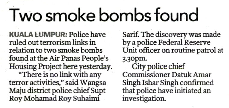 Police have ruled out terrorism links in relation to two smoke bombs found at the Air Panas People's Housing Project in Kuala Lumpur yesterday.