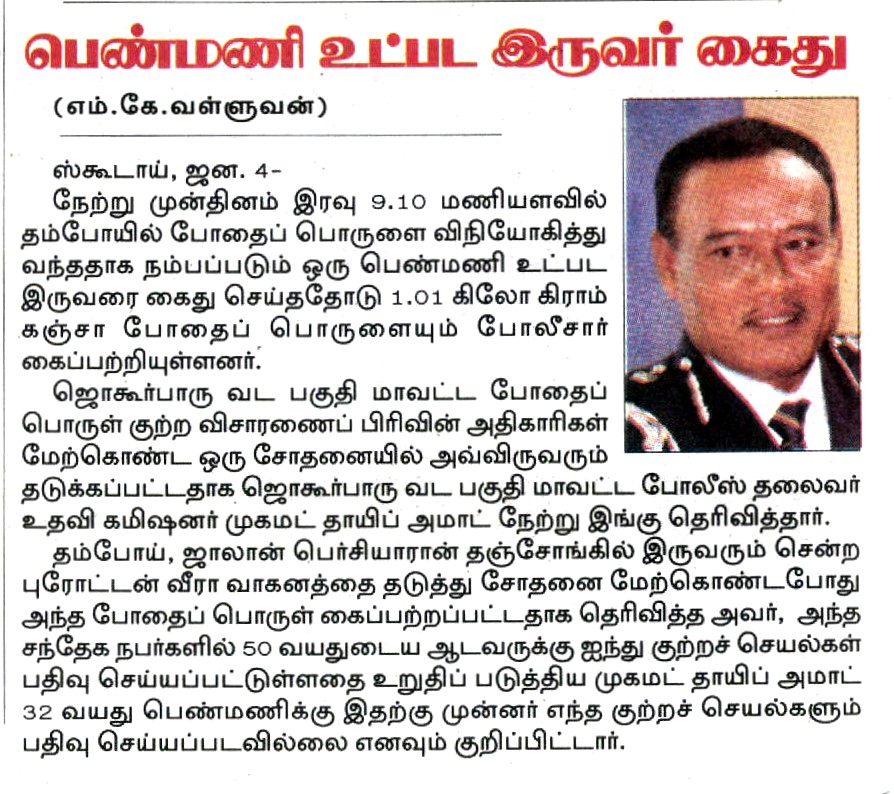 Dua suspek termasuk seorang wanita berusia 32 tahun yang dipercayai mengedar dan menjual dadah berjaya ditahan polis dalam satu serbuan yang dijalankan di Jalan Persiaran Tanjung, Tampoi, Skudai, Johor Bahru pada 2 Januari lalu.