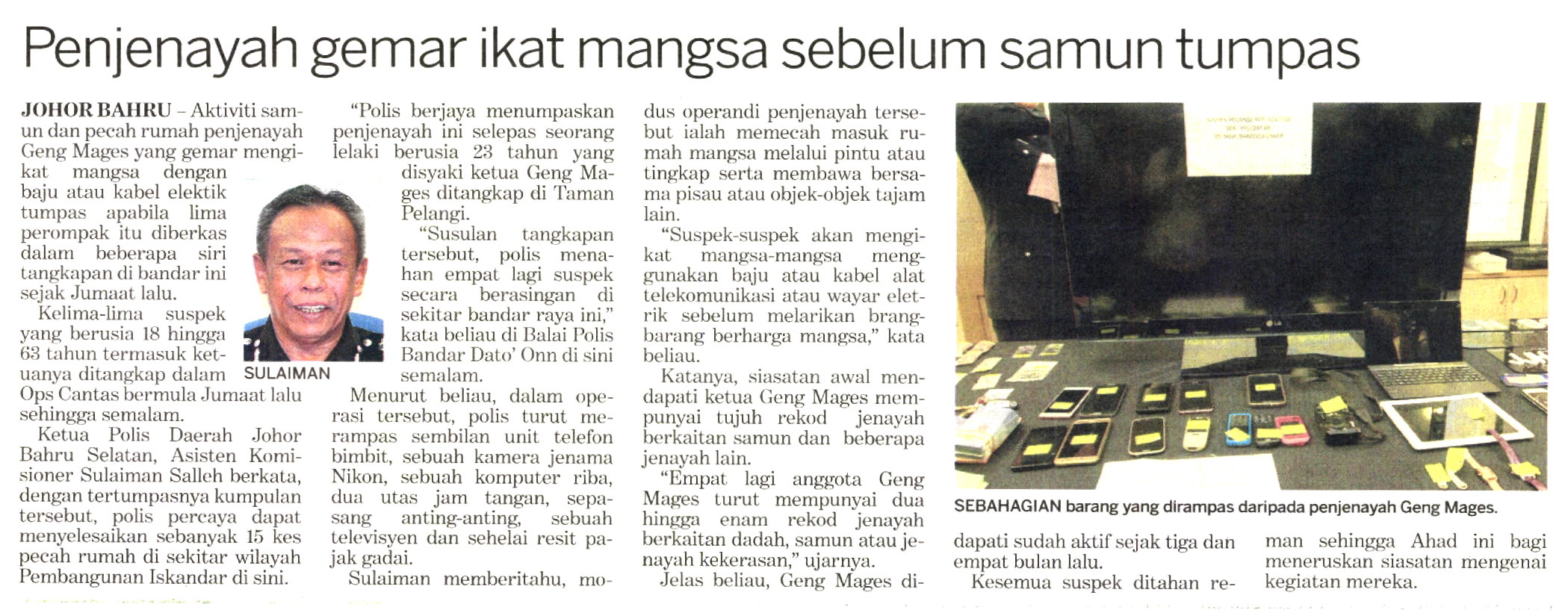 Aktiviti samun dan pecah rumah penjenayah Geng Mages yang gemar mengikat mangsa dengan baju atau kabel elektrik tumpas apabila lima perompak itu diberkas dalam Op Cantas bermula Jumaat lalu di Johor Bahru.
