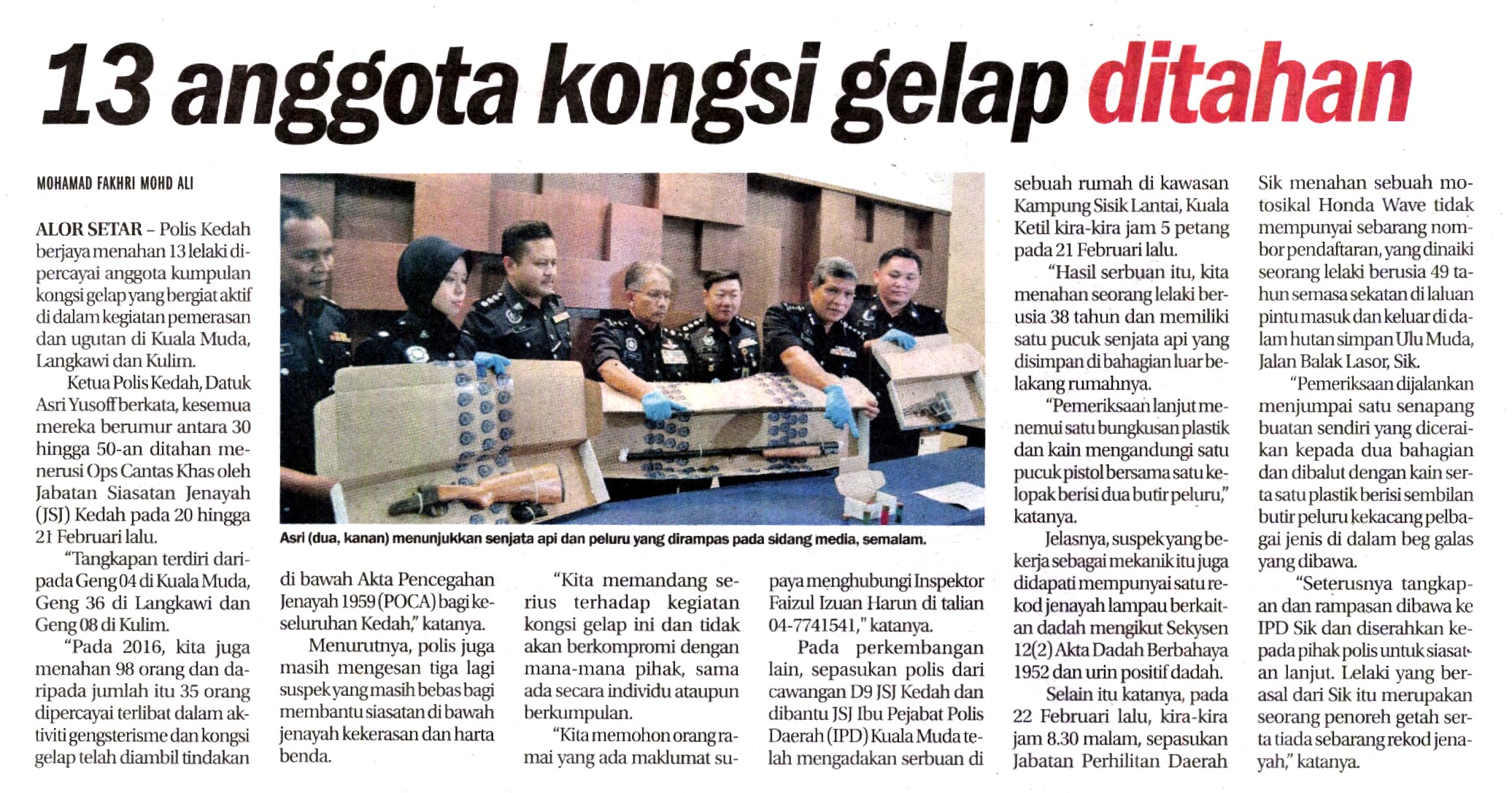 Polis Kedah berjaya menahan 13 lelaki dipercayai anggota kumpulan kongsi gelap yang bergiat aktif di dalam kegiatan pemerasan dan ugutan di Kuala Muda, Langkawi dan Kulim.