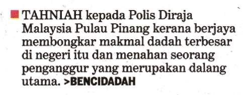 Ucapan penghargaan daripada pembaca akhbar Kosmo, BENCIDADAH yang memberikan penghargaan kepada pasukan polis dari Ibu Pejabat Polis Kontinjen (IPK) Pulau Pinang yang berjaya menumpaskan satu sindiket dadah terbesar di negeri Pulau Mutiara itu.