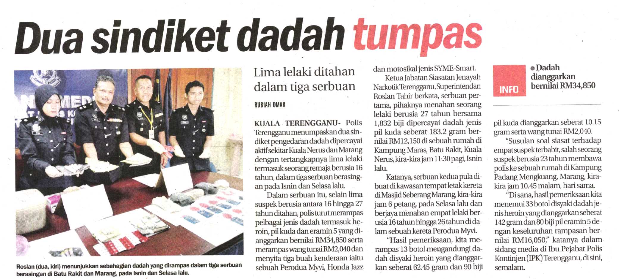 Jabatan Siasatan Jenayah Narkotik (JSJN) Ibu Pejabat Polis Kontinjen (IPK) Terengganu menumpaskan dua sindiket pengedaran dadah dipercayai aktif sekitar Kuala Nerus dan Marang dengan tertangkapnya lima lelaki termasuk seorang remaja berusia 16 tahun, dalam tiga serbuan berasingan pada Isnin dan Selasa lalu.