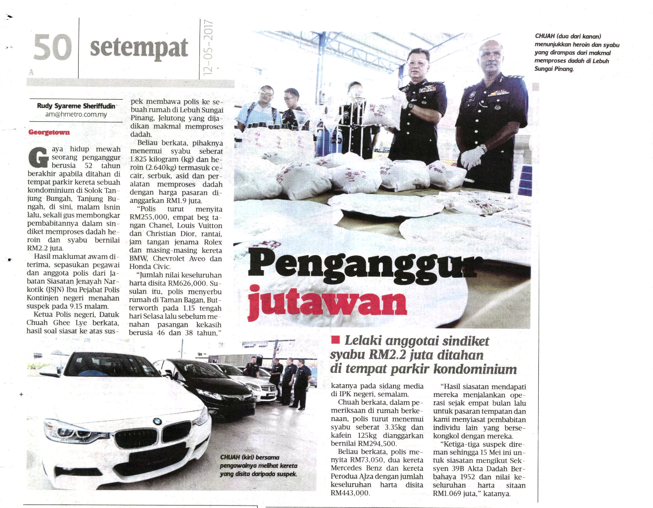 Gaya hidup mewah seorang penganggur berusia 52 tahun berakhir apabila ditahan di tempat parkir kereta sebuah kondominium di Solok Tanjung Bungah, di Pulau Pinang, malam Isnin lalu, sekali gus membongkar pembabitannya dalam sindiket memproses dadah jenis Heroin dan Syabu bernilai RM2.2 juta.