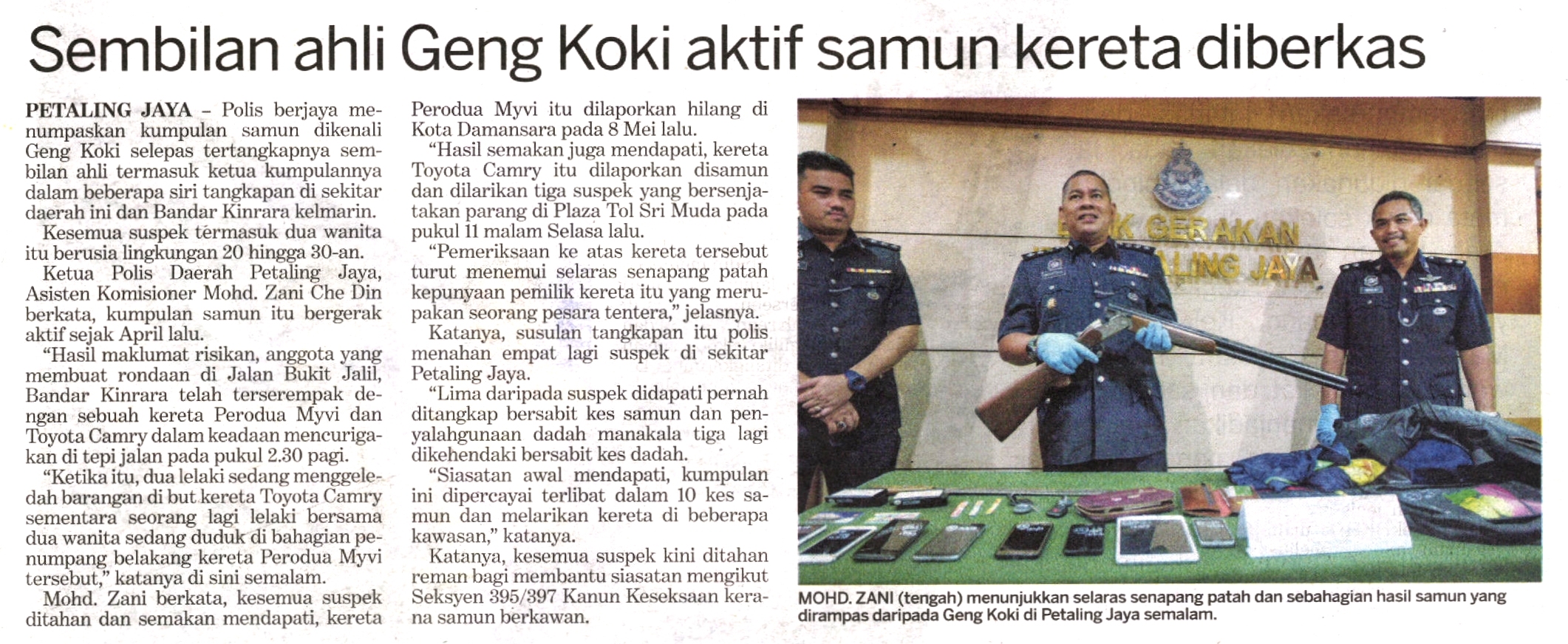 Polis berjaya menumpaskan kumpulan samun dikenali Geng Koki selepas tertangkapnya sembilan ahli termasuk ketua kumpulannya dalam beberapa siri tangkapan di sekitar daerah Petaling Jaya dan Bandar Kinrara, kelmarin.