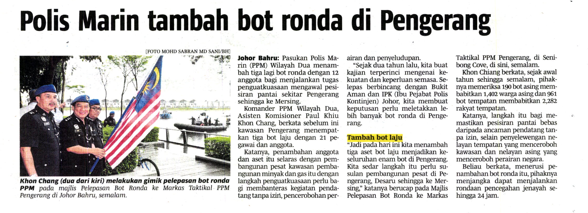 Pasukan Polls Marin (PPM) Wilayah Dua menambah tiga lagi bot ronda dengan 12 anggota bagi menjalankan tugas penguatkuasaan mengawal pesisiran pantai sekitar Pengerang sehingga ke Mersing.