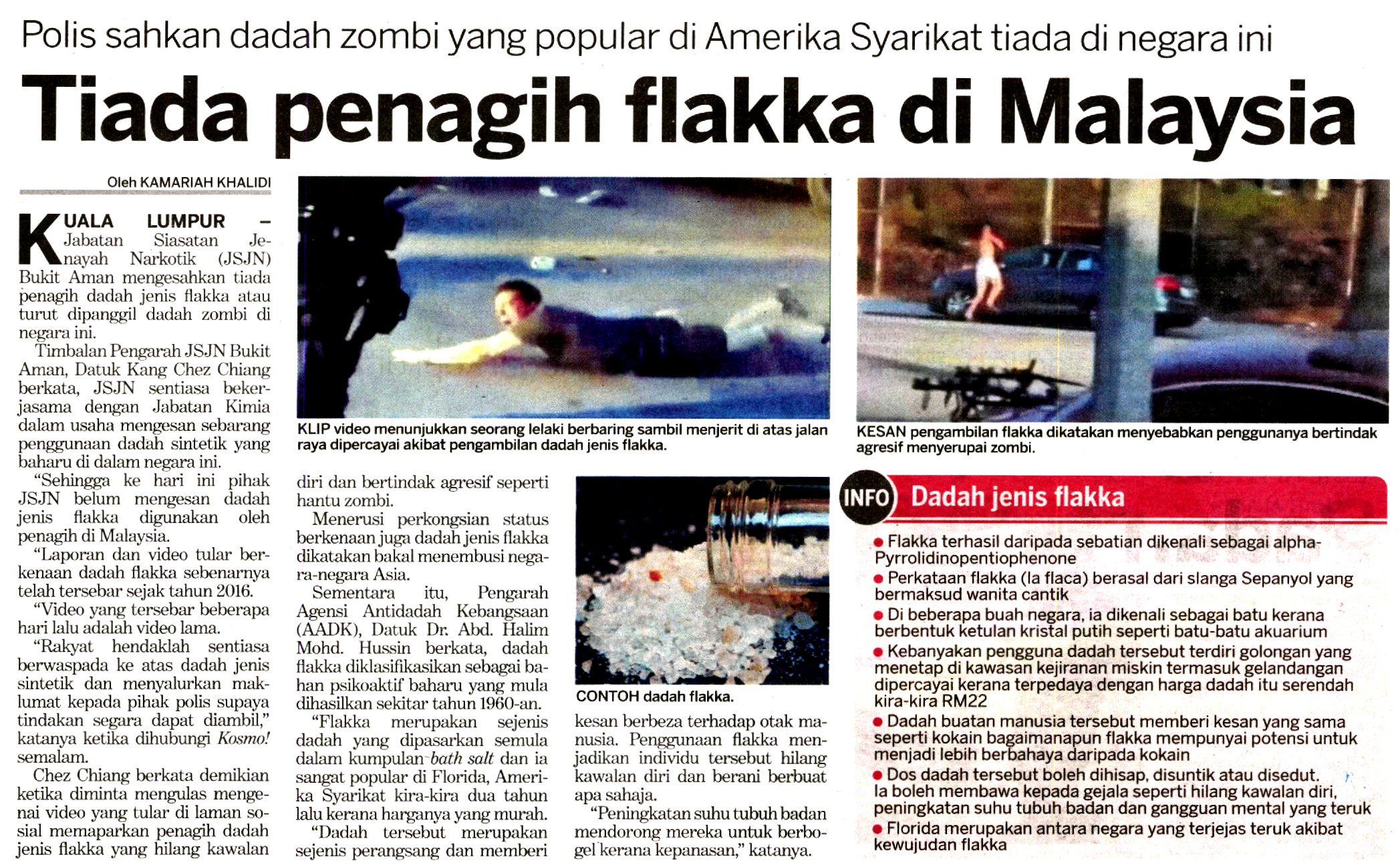 Jabatan Siasatan Jenayah Narkotik (JSJN), Bukit Aman mengesahkan negara ini masih bebas dari sebarang penggunaan dadah jenis Flakka atau lebih dikenali sebagai dadah 'zombie'.