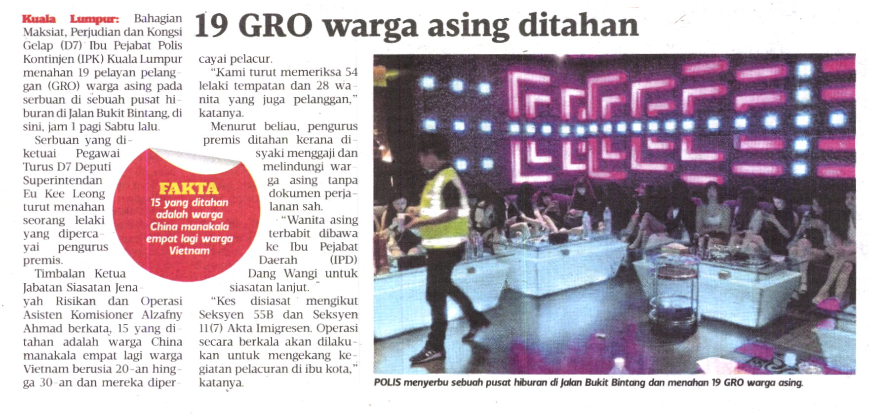 Seramai 19 pelayan pelanggan (GRO) warga asing dari negara China dan Vietnam ditahan dalam satu serbuan yang dijalankan di premis hiburan dekat Jalan Bukit Bintang, Kuala Lumpur.