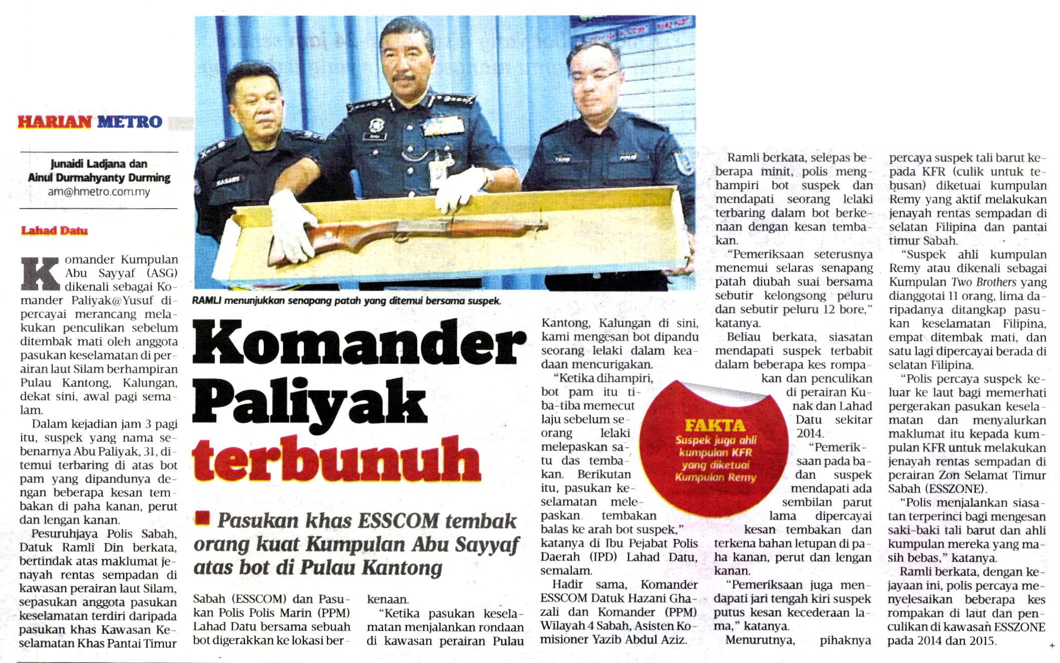 "Suspek ahli kumpulan Remy atau dikenali sebagai Kumpulan Two Brothers yang dianggotai 11 orang, lima daripadanya ditangkap pasukan keselamatan Filipina, empat ditembak mati, dan satu lagi dipercayai berada di selatan Filipina.