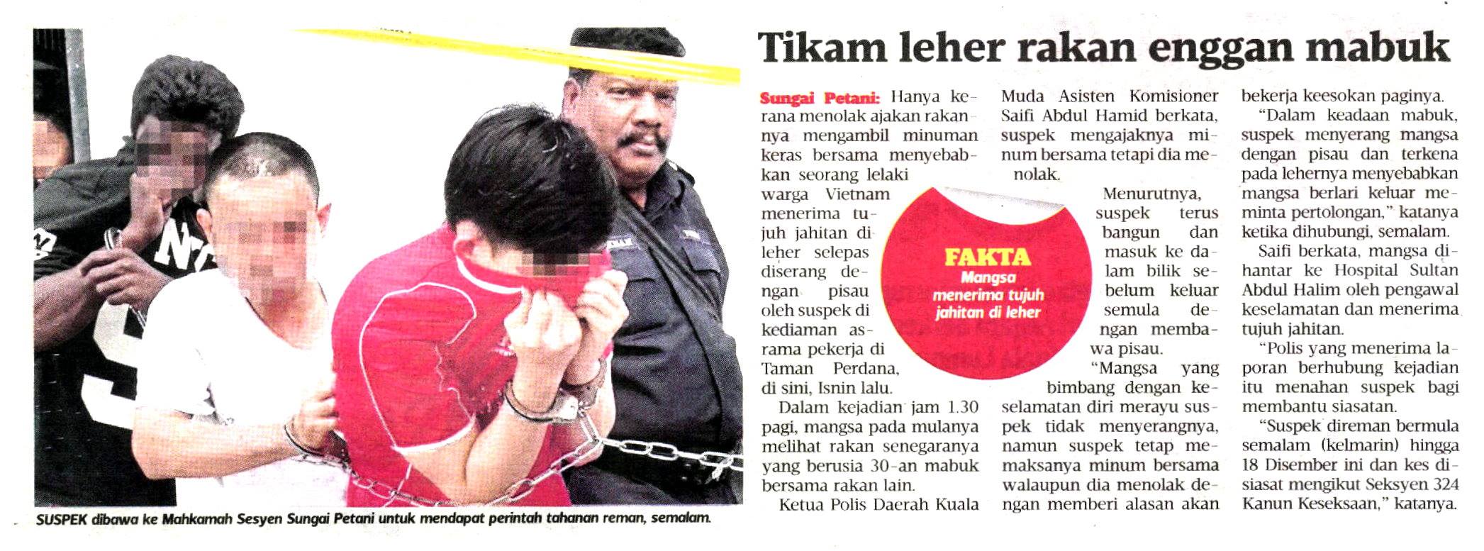Hanya kerana monolak ajakan rakan nya mengambil minuman keras bersama menyebabkan seorang lelaki warga Vietnam rnenerima tujuh jahitan di leher sclepas diserang dengan pisau oleh suspek di kediaman asrama pekerja di Taman Perdana, di Sungai Petani, Kedah Isnin lalu.