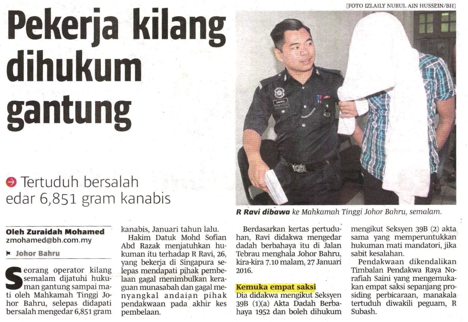 Hakim Datuk Mohd Sofian Abd Razak menjatuhkan hukuman itu terhadap R Ravi, 26, yang bekerja di Singapura selepas mendapati pihak pembelaan gagal menimbulkan keraguan munasabah dan gagal menyangkal andaian pihak pendakwaan pada akhir kes pembelaan.