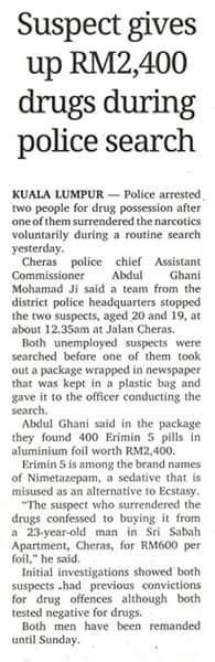 Both unemployed suspects were searched before one of them took out a package wrapped in newspaper that was kept in a plastic bag and gave it to the officer conducting the search, Abdul Ghani said in the package they found 400 Erimin 5 pills in aluminium foil worth RM2,400.