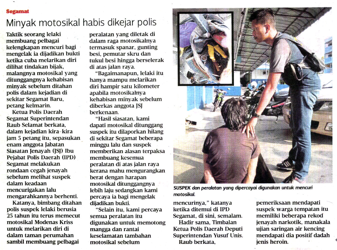 “Hasil siasatan, kami dapati motosikal ditunggang suspek itu dilaporkan hilang di sekitar Segamat beberapa minggu lalu dan suspek memberikan alasan terpaksa membuang kesemua peralatan di atas jalan raya kerana mahu mengurangkan berat dengan harapan motosikal ditunggangnya lebih laju sedangkan kami percaya ia bagi mengelak dijadikan bukti.