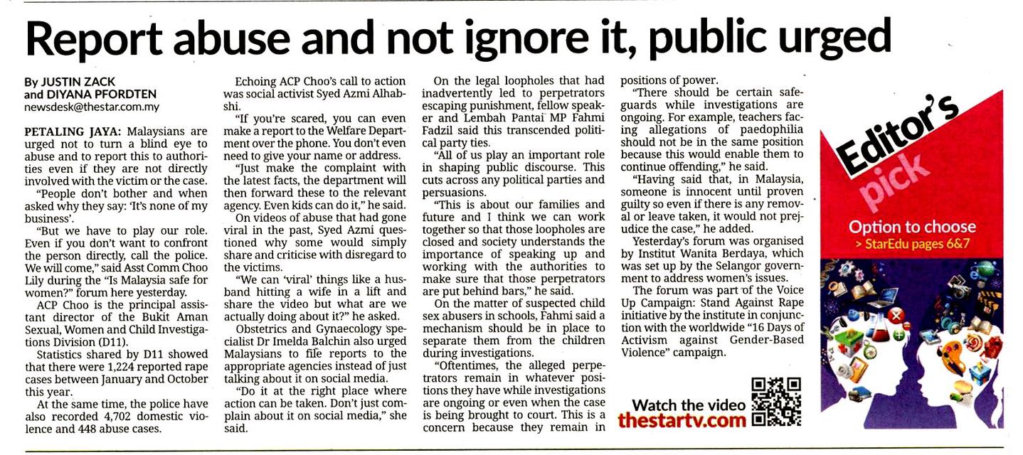 Petaling Jaya, 1st December 2019 - Malaysians are urged not to turn a blind eye to abuse and to report this to authorities even if they are not directly involved with the victim or the case.