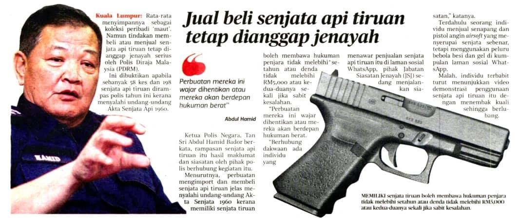 Kuala Lumpur, 21 September 2020 – Rata-rata menyimpannya sebagai koleksi peribadi 'maut'. Namun tindakan membeli atau menjual senjata api tiruan tetap dianggap jenayah serius oleh Polis Diraja Malaysia (PDRM).