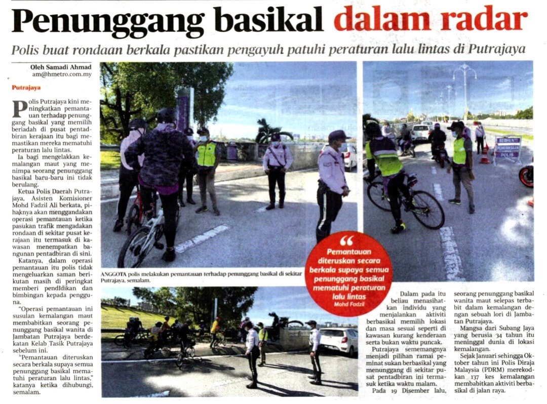 Putrajaya, 29 Disember 2020 - Polis Putrajaya kini meningkatkan pemantauan terhadap penunggang basikal yang memilih beriadah di pusat pentadbiran kerajaan itu bagi memastikan mereka mematuhi peraturan lalu lintas.