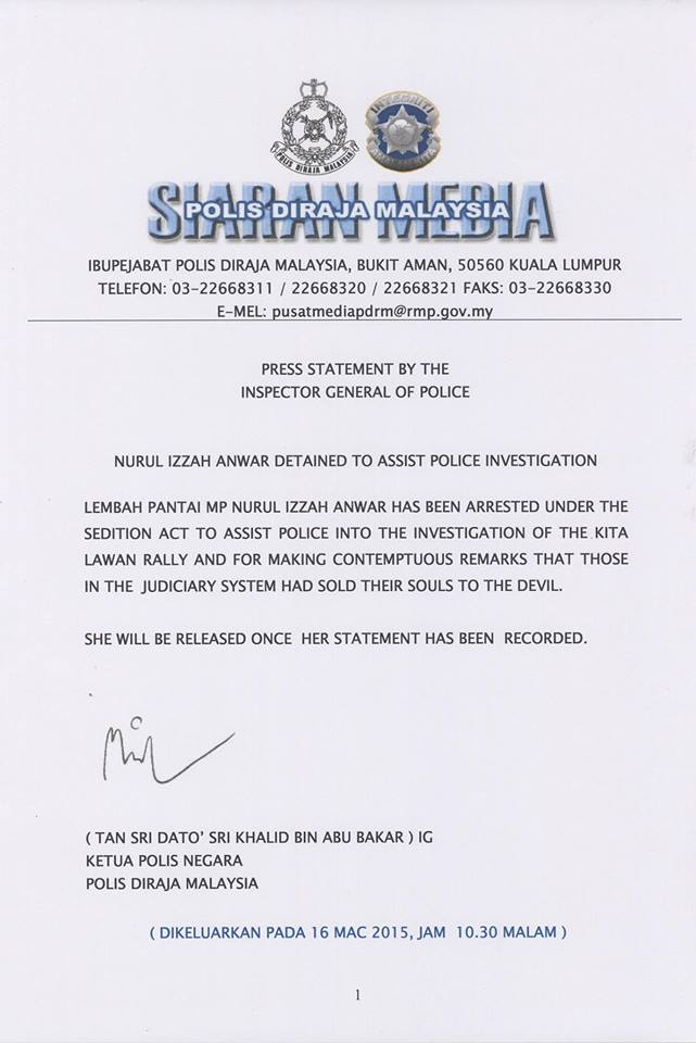 KENYATAAN MEDIA KPN: NURUL IZZAH ANWAR DETAINED TO ASSIST POLICE INVESTIGATION