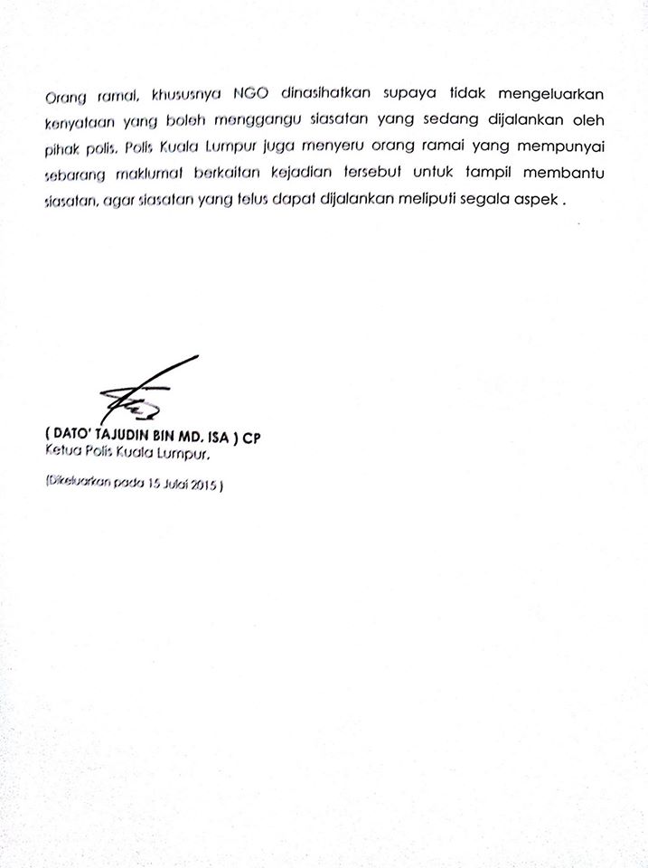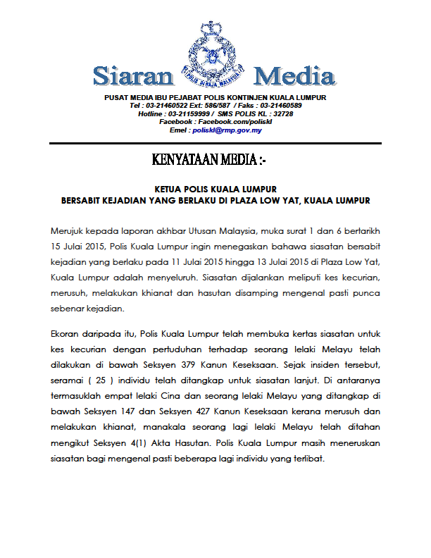 Merujuk kepada laporan akhbar Utusan Malaysia, muka surat 1 dan 6 bertarikh 15 Julai 2015, Polis Kuala Lumpur ingin menegaskan bahawa siasatan bersabit kejadian yang berlaku pada 11 Julai 2015 hingga 13 Julai 2015 di Plaza Low Yat, Kuala Lumpur adalah menyeluruh. Siasatan dijalankan meliputi kes kecurian, merusuh, melakukan khianat dan hasutan disamping mengenal pasti punca sebenar kejadian.