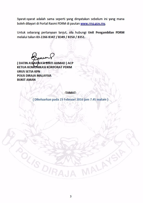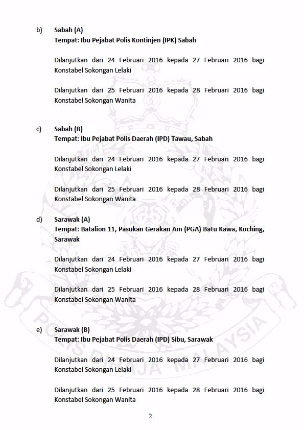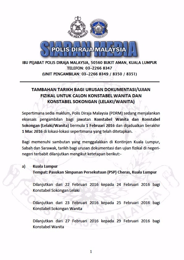 SIARAN MEDIA: TAMBAHAN TARIKH DOKUMENTASI/UJIAN FIZIKAL CALON KONSTABEL WANITA DAN KONSTABEL SOKONGAN (LELAKI/WANITA)
