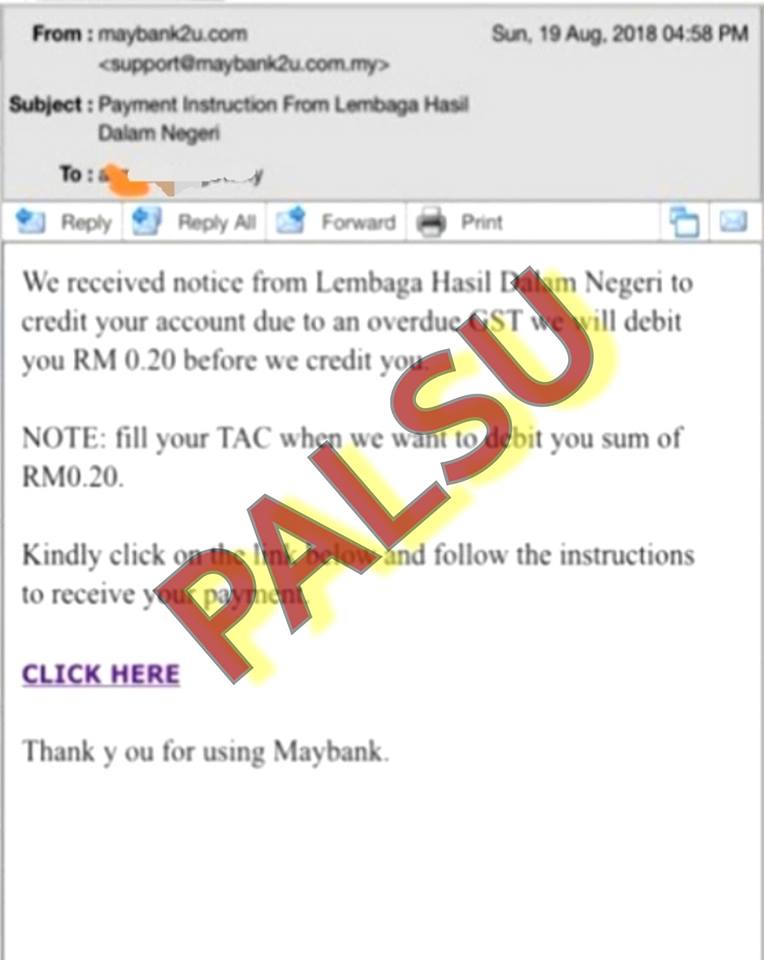 Sebaik mangsa menekan pautan laman web kemaskini akaun dan memasukkan kata laluan serta maklumat pengenalan, data itu akan diambil suspek untuk melakukan transaksi dalam talian.
