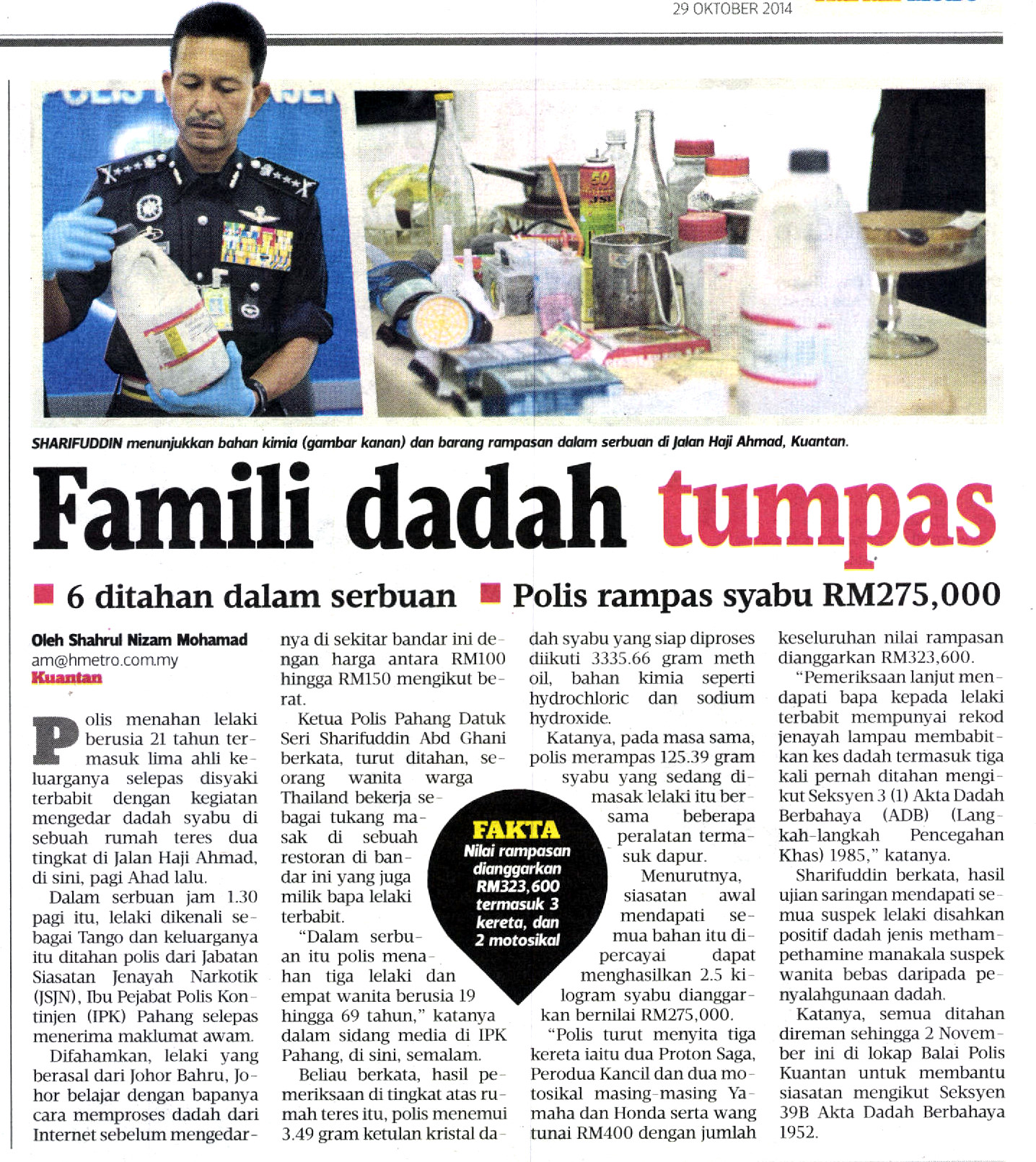 Menurutnya Ketua Polis Pahang, Senior DCP Dato' Seri Sharifuddin Abd Ghani, siasatan awal mendapati semua bahan itu dipercayai dapat menghasilkan 2.5 kilogram syabu dianggarkan bernilai RM275,000.