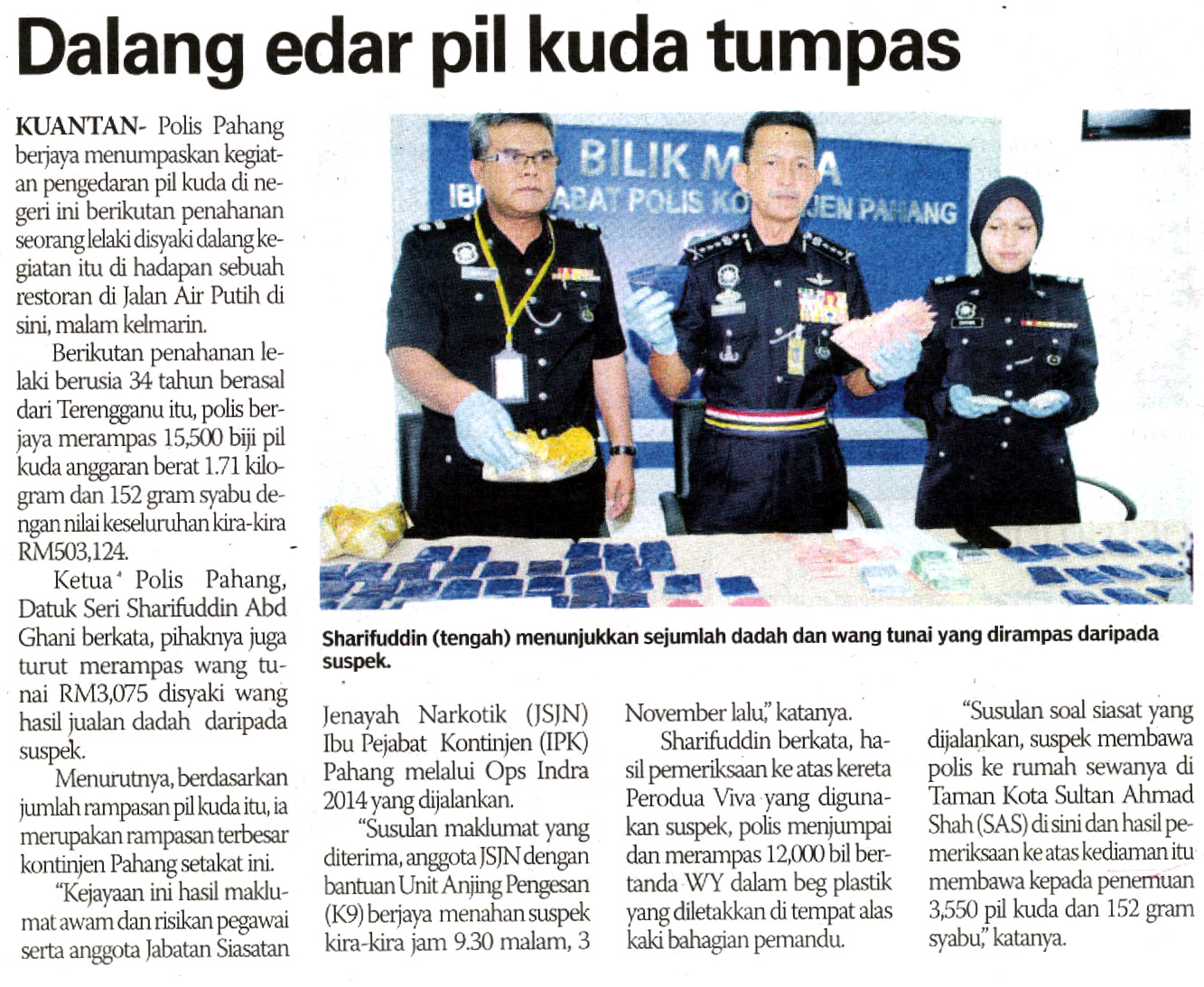"Kejayaan ini hasil maklumat awam dan risikan pegawai serta anggota Jabatan Siasatan Jenayah Narkotik (JSJN) Ibu Pejabat Kontinjen (IPK) Pahang melalui Ops Indra 2014 yang dijalankan.