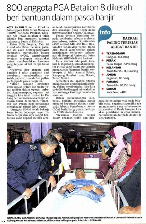 Kota Bharu, 2 Jan - Kira-kira 800 anggota Polis Diraja Malaysia (PDRM) daripada Pasukan Gerakan Am (PGA) Batalion 8 telah dikerah bagi memberi bantuan pada pasca banjir di Kelantan.