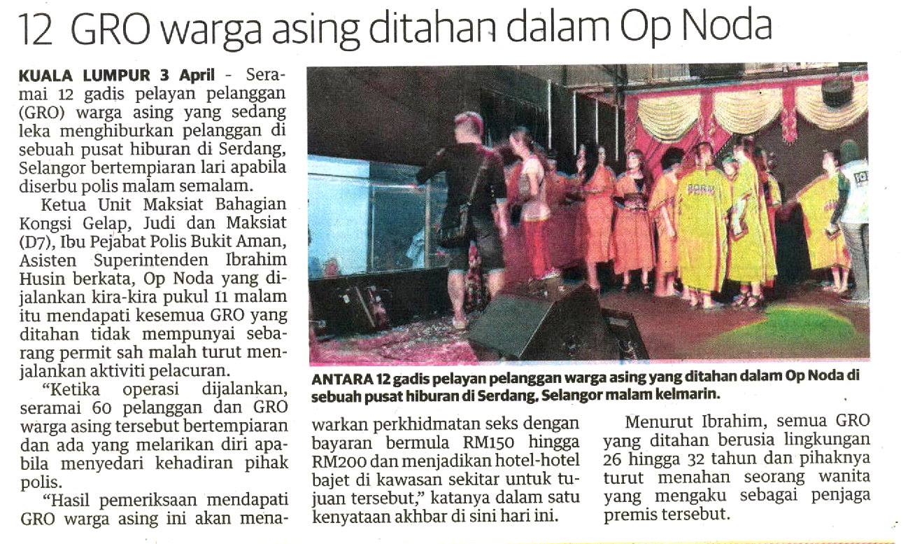 Ketua Unit Maksiat Bahagian Kongsi Gelap, Judi dan Maksiat (D7) Ibu Pejabat Polis Bukit Aman, Asisten Superitendan Ibrahim Husin berkata, Op Noda yang dijalankan kira-kira pukul 11 malam itu mendapati kesemua GRO yang ditahan tidak mempunyai sebarang permit sah malah turut menjalankan aktiviti pelacuran.
