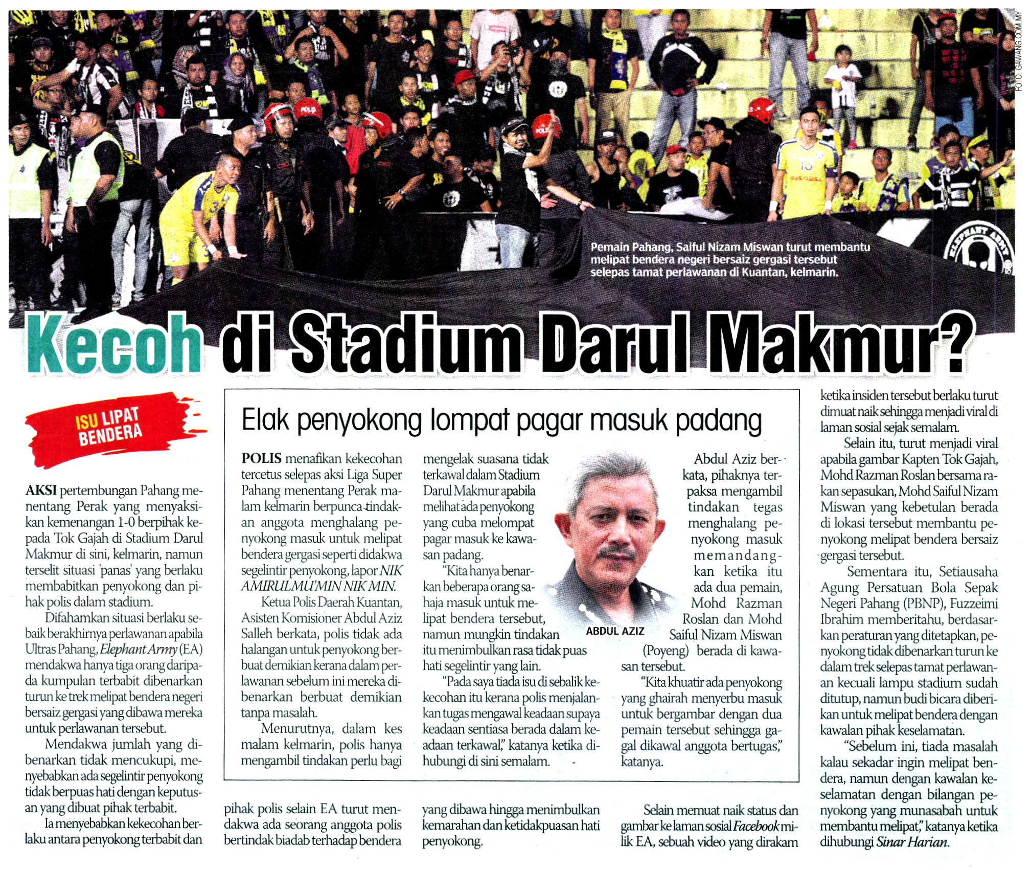 Polis menafikan kekecohan tercetus selepas aksi Liga Super Pahang menentang Perak malam kelmarin berpunca tindakan anggota menghalang penyokong masuk untuk melipat bendera gergasi seperti didakwa segelintir penyokong.