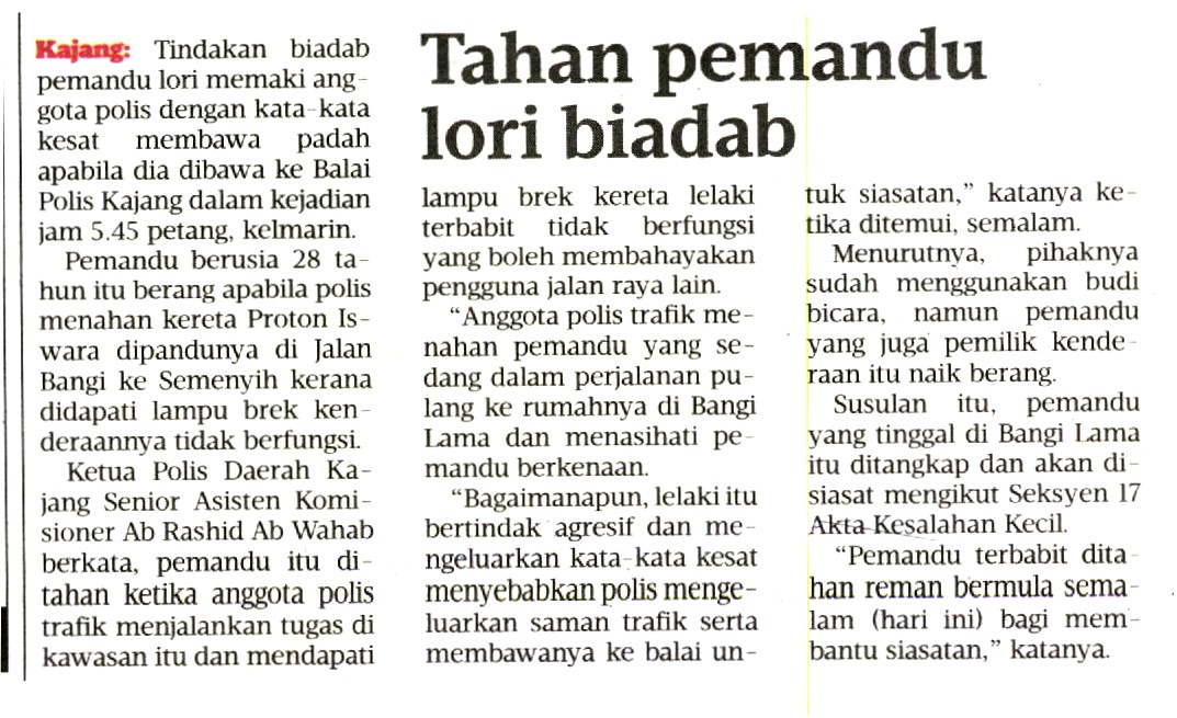 Tindakan biadab pemandu lori memaki anggota polis bertugas dengan kata-kata kesat membawa padah apabila dia dibawa ke Balai Polis Kajang petang kelmarin.