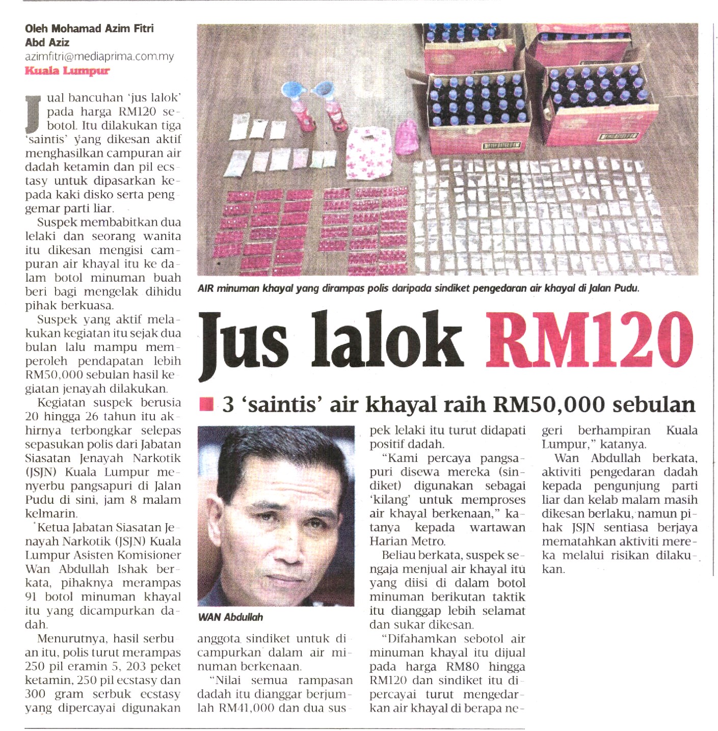 Ketua Jabatan Siasatan Jenayah Naroktik (KJSJN) Kuala Lumpur, ACP Wan Abdullah Ishak berkata, dalam serbuan yang dilakukan di sebuah pangsapuri itu polis turut merampas sebanyak 91 botol minuman khayal jenis beri yang telah dicampurkan dengan najis dadah.