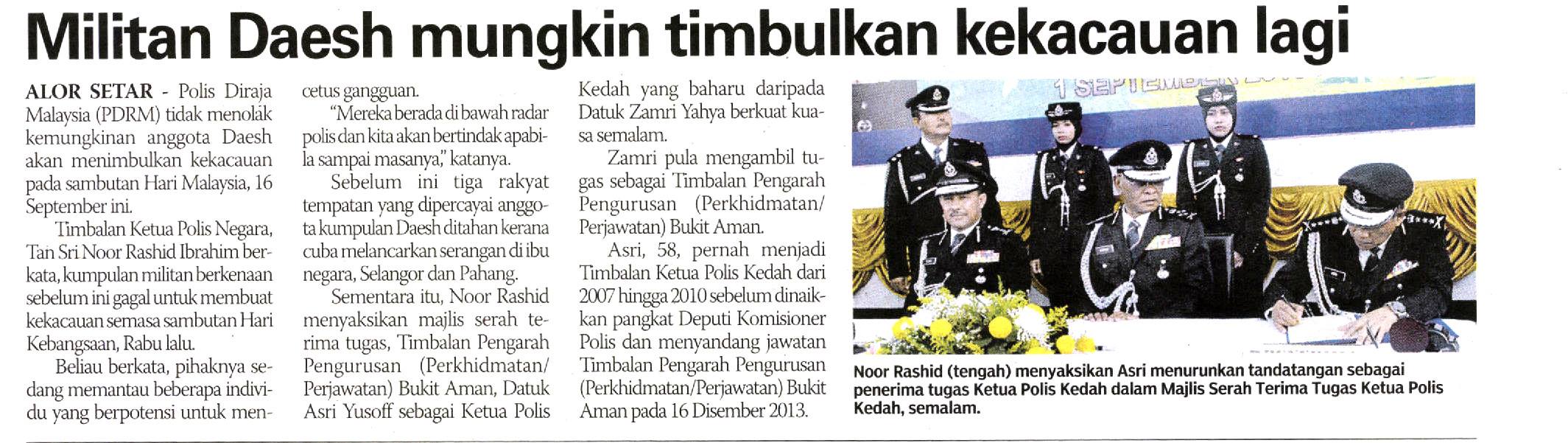 Alor Setar - Polis Diraja Malaysia (PDRM) tidak menolak kemungkinan anggota Daesh akan menimbulkan kekacauan pada sambutan Hari Malaysia, 16 September ini.