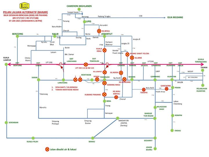 Berikut adalah kemaskini sehingga jam 6.30 petang hari ini bagi jalan raya dan lebuh raya di negeri Pahang yang telah ditutup kerana dinaiki air serta boleh membahayakan nyawa pengguna.