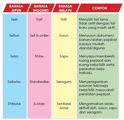 Konsep 5S ini diceduk dari Negara Jepun dan istilah 5S juga berasal dari Bahasa Jepun iaitu Seiri, Seiton, Seiso, Seiketsu dan Shitsuke. Ia kemudiannya diterjemahkan ke Bahasa Melayu dan Bahasa Inggeris yang membawa maksud seperti di bawah:-